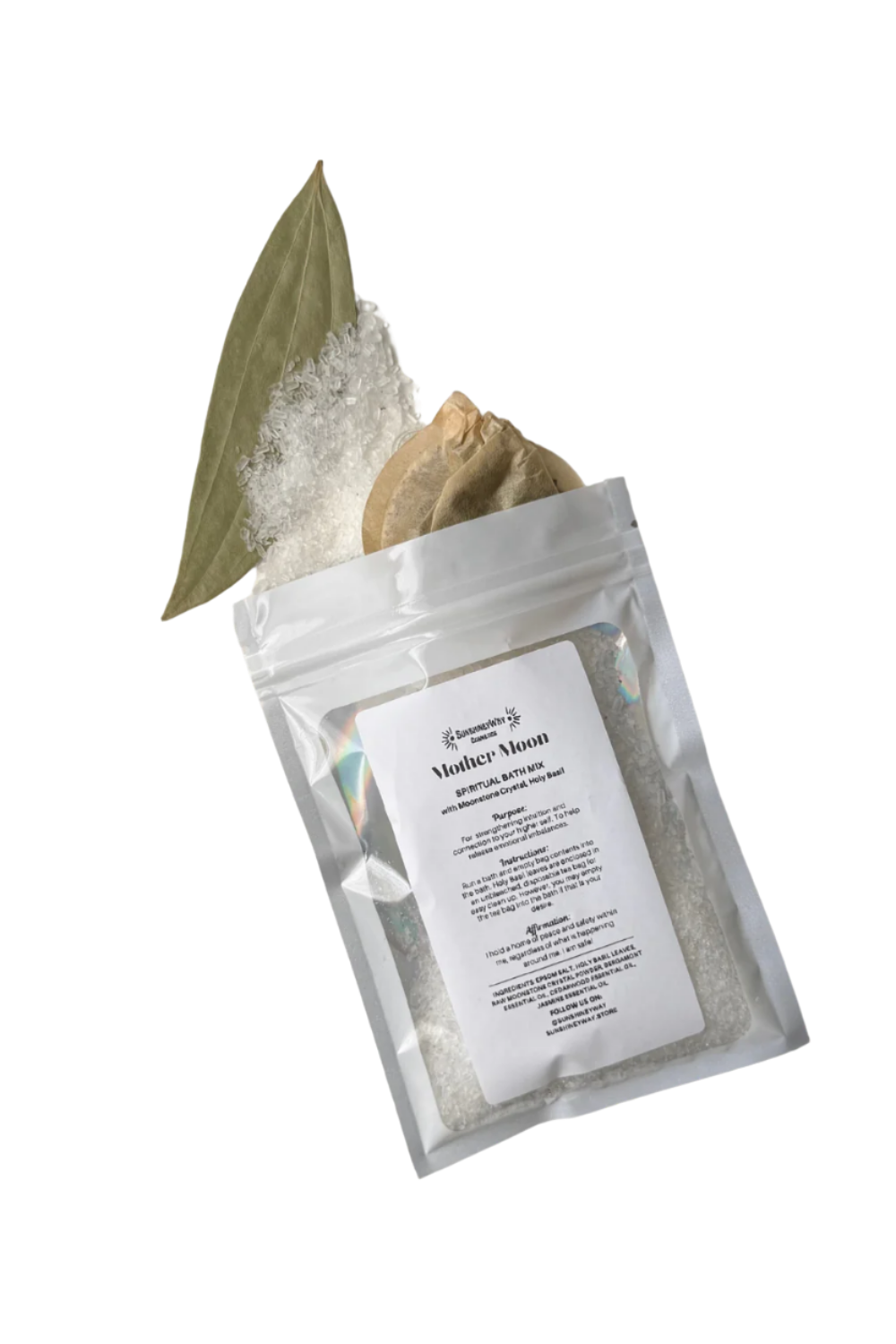 Mother Moon has an epsom salt base with a mixture of essential oils including bergamont, cedarwood, and jasmine. This blend of essential oils creates an ethereal woody essence that helps relax the senses and assist in your grounding practices.